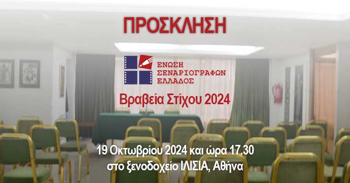 Πρόσκληση στα Βραβεία Στίχου 2024 της Ένωσης Σεναριογράφων Ελλάδος και στην 2η επέτειο της Λέσχης Τέχνης και Πολιτισμού της Ε.Σ.Ε.