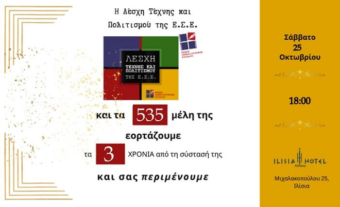 Γενέθλια Λέσχης Τέχνης και Πολιτισμού της Ε.Σ.Ε. 25 Οκτωβρίου 2025 18.00 ξεν/ο ΙΛΙΣΙΑ Μιχαλακοπούλου 25