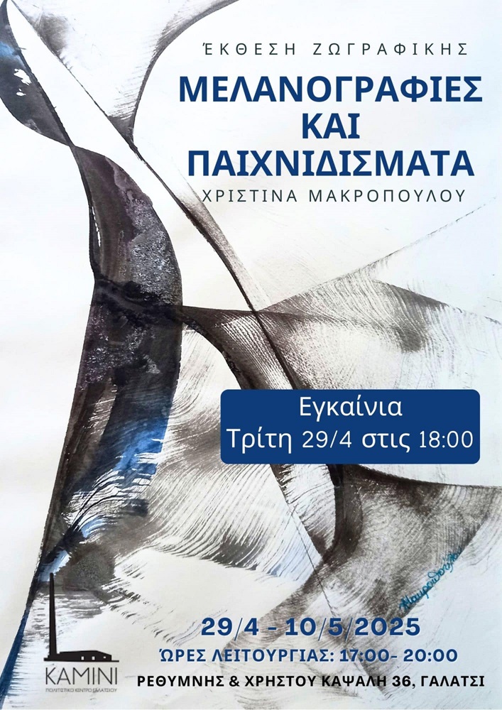 ΧΡΙΣΤΙΝΑ ΜΑΚΡΟΠΟΥΛΟΥ: «Μελανογραφίες και Παιχνιδίσματα» ατομική έκθεση,στο Καμίνι Πολιτιστικό Κέντρο Γαλατσίου