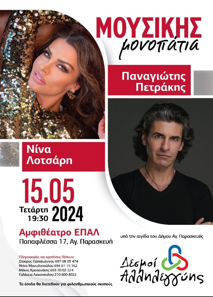 Φιλανθρωπική εκδήλωση από τους Δεσμούς Αλληλεγγύης και τους Νίνα Λοτσάρη & Παναγιώτη Πετράκη | Τετάρτη 15 Μαΐου