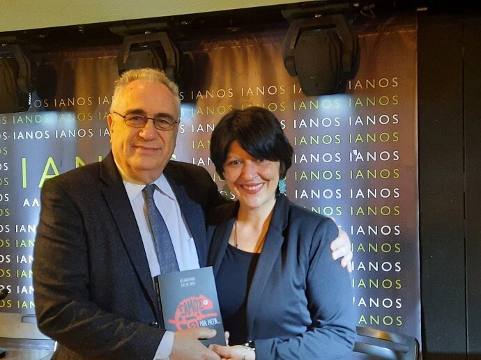 Η Σαμία συγγραφέας Έλενα Χουσνή με τον Αλέξανδρο Κακαβά, Πρόεδρο της Ε.Σ.Ε., στην παρουσίαση του βιβλίου ΣΑΜΟΣ ΜΙΑ ΜΕΡΑ