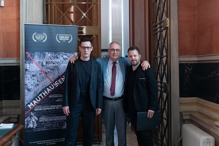 Ο Πρόεδρος της Ε.Σ.Ε. Αλ. Κακαβάς με τους συνδημιουργούς Αρ. Παπαδανιήλ και Παν. Κουντουρά στην παρουσίαση του MAUTHAUSEN των Καμπανέλλη/Θεοδωράκη στην Ακαδημία Αθηνών
