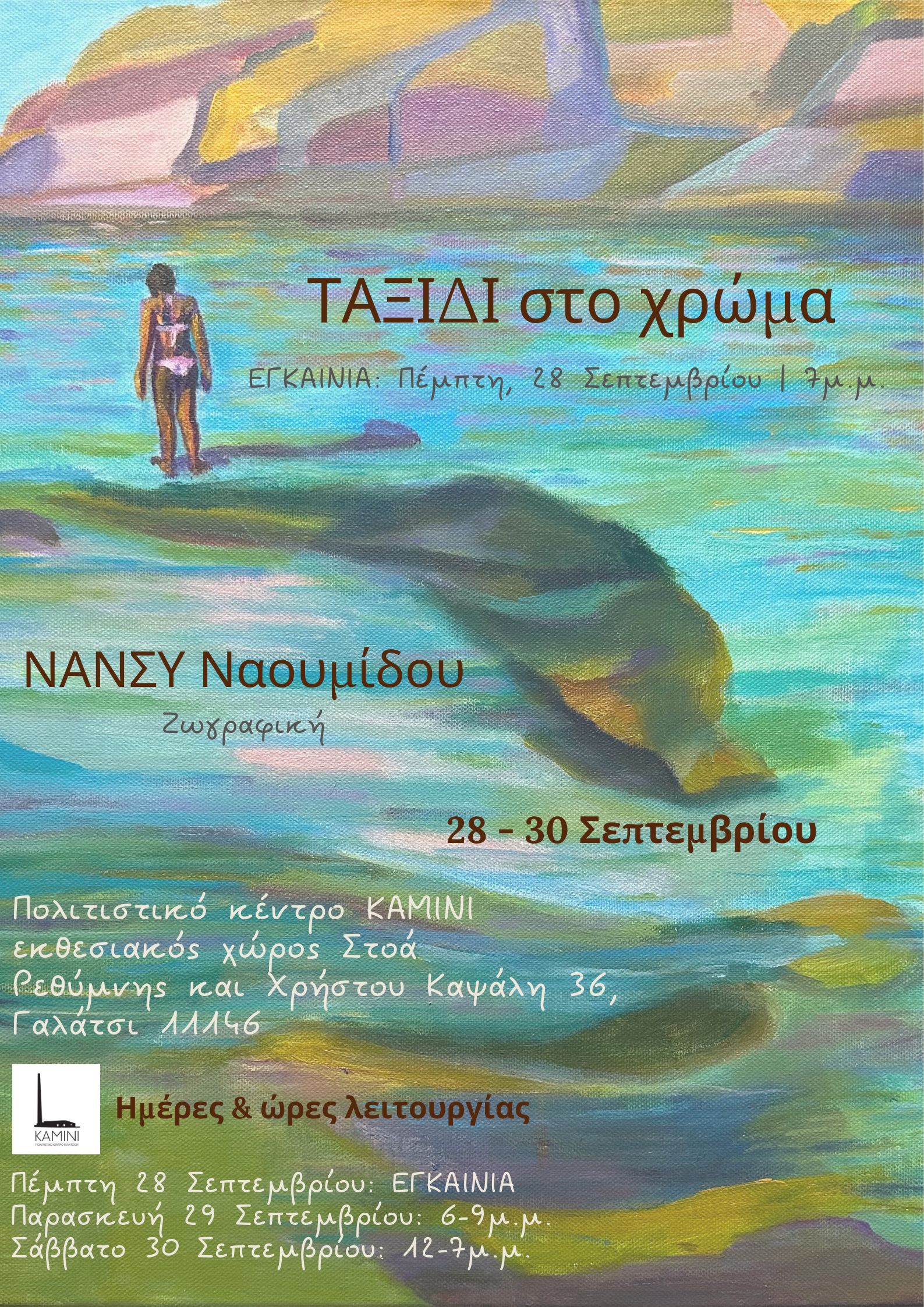 ΤΑΞΙΔΙ ΣΤΟ ΧΡΩΜΑ: Η ατομική έκθεση ζωγραφικής της Νάνσυς Ναουμίδου στο Πολιτιστικό Κέντρο ΚΑΜΙΝΙ – Εγκαίνια: Πέμπτη, 28 Σεπτεμβρίου και ώρα 7μ.μ.