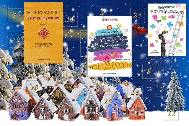 Ημερολόγια από τις Εκδόσεις Παπαδόπουλος, στην προθήκη της αυλής μας