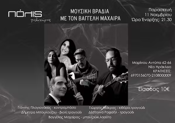 ΜΟΥΣΙΚΗ ΒΡΑΔΙΑ ΜΕ ΤΟΝ ΒΑΓΓΕΛΗ ΜΑΧΑΙΡΑ - ΠΑΡΑΣΚΕΥΗ 11 ΝΟΕΜΒΡΙΟΥ ΣΤΙΣ 21.30