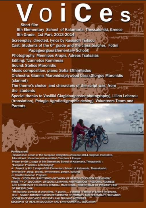 Στο πλαίσια του προγράμματος Αγωγή Υγείας της Πρωτοβάθμιας Εκπαίδευσης, Στους ίδιους ΣΤ1 του 6ου Δημοτικού Σχολείου Καλαμαριάς Θεσσαλονίκης, πραγματοποίησε το Μάιο του 2014 του έργου και ταινία μικρού μήκους με θέμα την ενδοσχολική βία. Αξίζει να σημειωθεί ότι ...