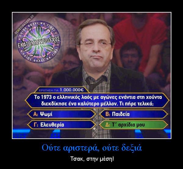 Η λάθος απάντηση του Σαμαρά για τη χούντα του 1973!!! Aylogyros News Η παλιά μας αυλή 26 Ιουνίου 2014 Εκτός τόπου και χρόνου για μια ακόμα φορά ήταν ο Αντώνης Σαμαρά καθώς ...πιάστηκε αδιάβαστος για το τι διεκδικούσε ο ελληνικός λαός ΑΠΌ ΤΗ χούντα ΤΟΥ 1973, με αποτέλεσμα να έχει γίνει ο περίγελος του κόσμου! Προηγούμενο Επόμενο
