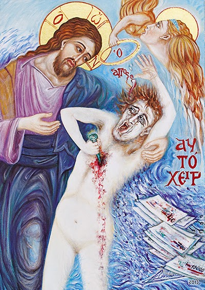 Γροθιά στο στομάχι και έντονο προβληματισμό προκαλεί με την αγιογραφία που επέλεξε να κάνει μια ταλαντούχα εικαστικός κάτω από τη σκιά της Ακρόπολης. Ο λόγος για τη Στέλλα Γιαννακοπούλου, η οποία, βαθιά επηρεασμένη από τη μάστιγα των αυτοκτονιών και το δράμα που κρύβεται πίσω από τα απονενοημένα διαβήματα, δημιούργησε τον «Αγιο Αυτόχειρα»! Ναι, καλά διαβάσατε ...