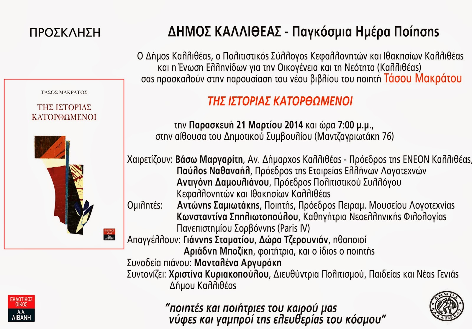 Συντονίζει: Χριστίνα Κυριακοπούλου, Διευθύντρια Πολιτισμού, Παιδείας και Νέας Γενιάς Δήμου Καλλιθέας “ποιητές και ποιήτριες του καιρού μας νύφες και γαμπροί της ελευθερίας του κόσμου”