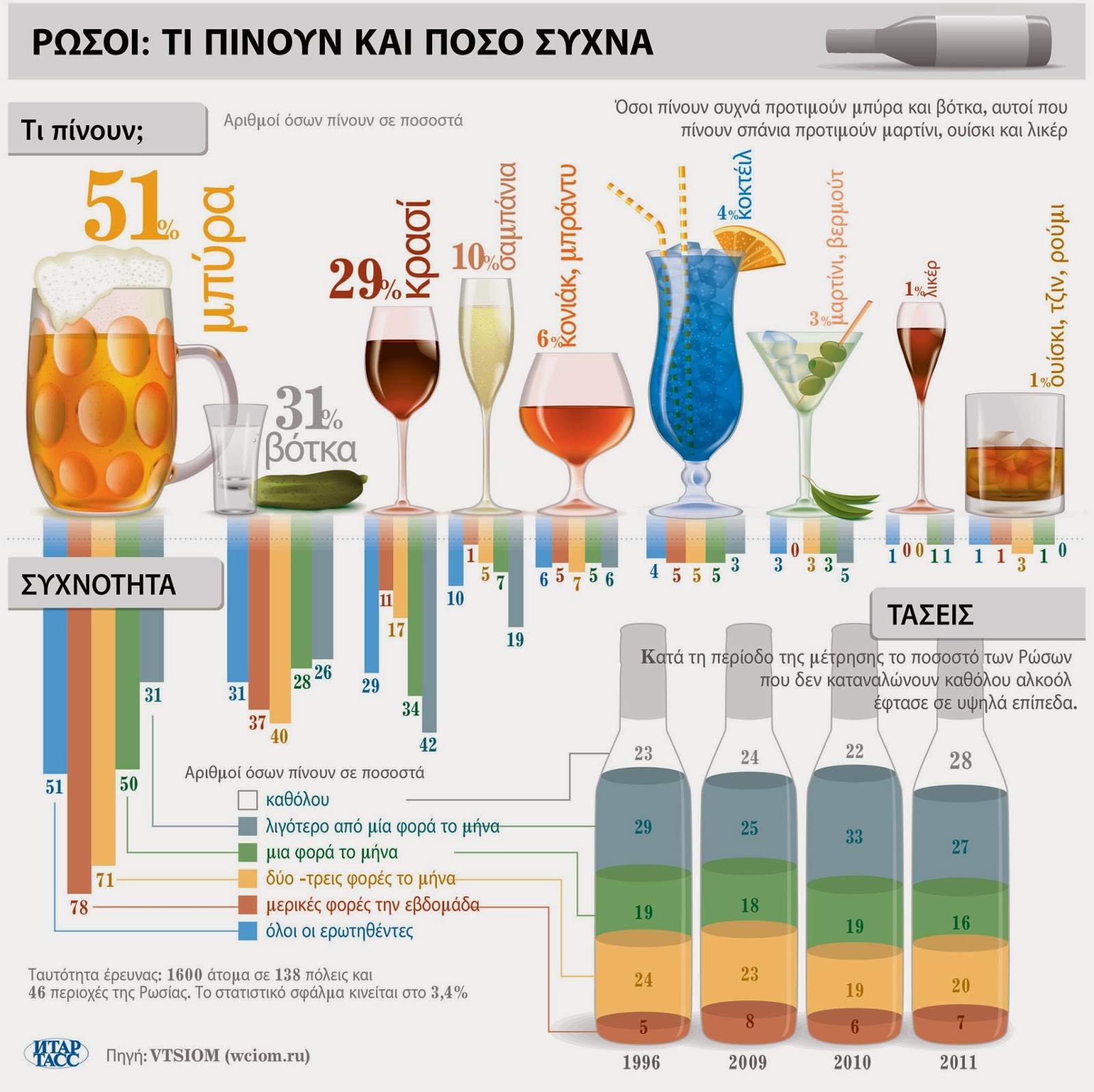 Πρώτη θέση στις προτιμήσεις των Ρώσων κατέχει η μπύρα, όπως φαίνεται και στο γράφημα της έρευνας που διενεργήθηκε σε δείγμα 1.600 πολιτών και σε 138 πόλεις της Ρωσίας.