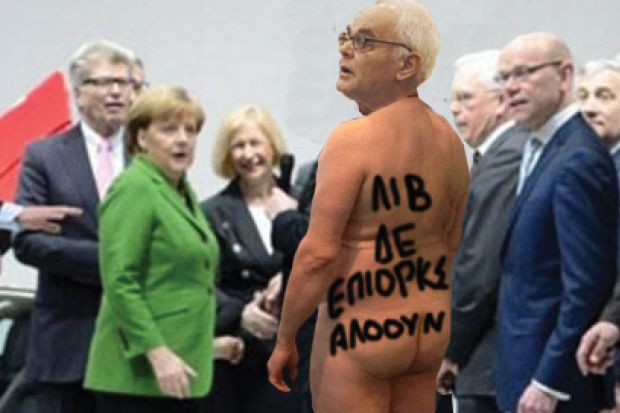 Σάλος από τη φωτογραφία με την οποία εμφανίζουν τον υπουργό... γυμνό μπροστά στη Μέρκελ να αντιδρά για τις απολύσεις!!!