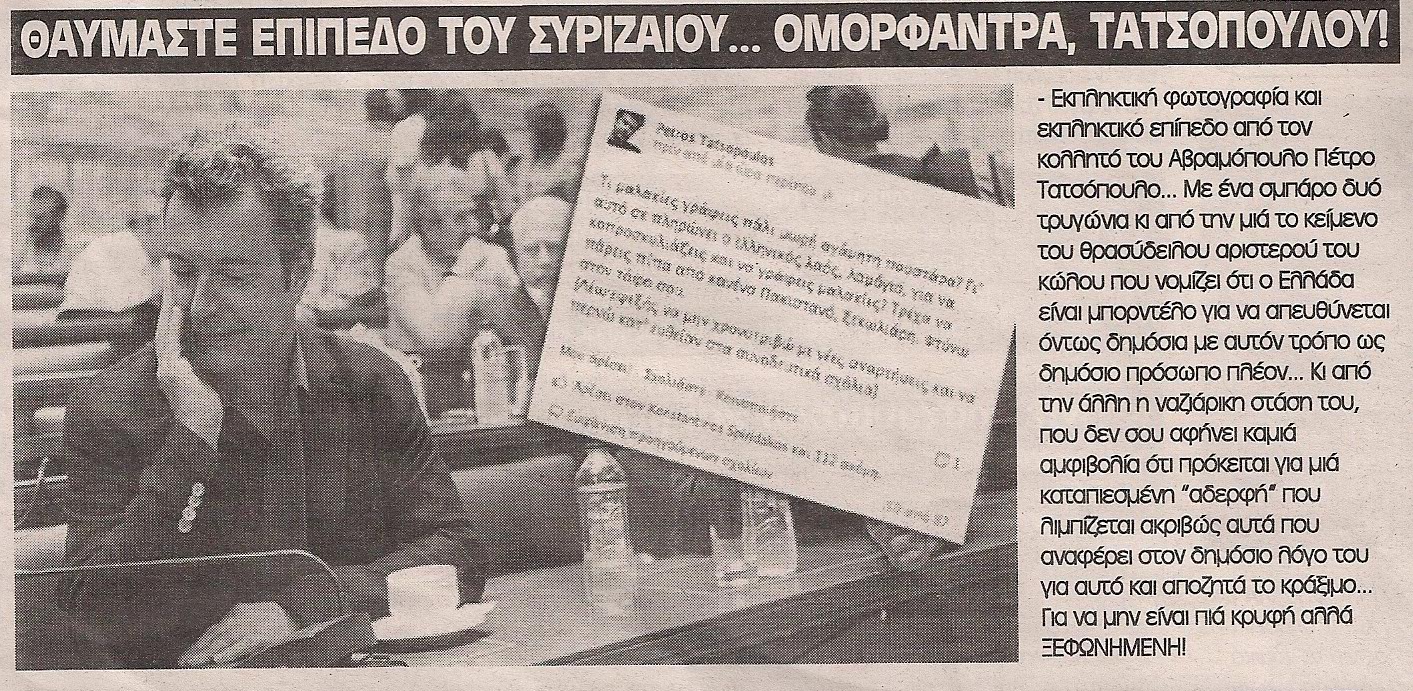 «Εκπληκτική φωτογραφία και εκπληκτικό επίπεδο από τον κολλητό του Αβραμόπουλου Πέτρο Τατσόπουλο… Με ένα σμπάρο δυο τρυγόνια κι από την μια το κείμενο του θρασύδειλου αριστερού του κώλου που νομίζει ότι η Ελλάδα είναι μπορντέλο για να απευθύνεται όντως δημόσια με αυτόν τρόπο ως δημόσιο πρόσωπο πλέον…