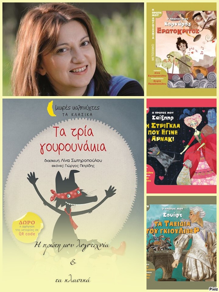 Η Λίνα Σωτηροπούλου γεννήθηκε και μεγάλωσε στον Πύργο Ηλείας. Σπούδασε λογιστική και στη δουλειά της ασχολείται καθημερινά με τους αριθμούς. Μια μέρα όμως μέσα από τα λογιστικά βιβλία –που μόνο πονοκέφαλο φέρνουν– άρχισαν να ξεπετάγονται γράμματα και να πλέκουν ιστορίες και παραμύθια. Κάπως έτσι αποφάσισε να ασχοληθεί με βιβλία που φέρνουν χαμόγελα σε παιδικά πρόσωπα.