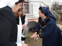 Αρχικά κάθε γυναίκα έγκυος ή μη, που δεν έχει περάσει το όριο ηλικίας, χύνει νερό στα χέρια της μαμής που θα προετοιμαστεί για τη γέννα. Το μπακιράκι το κλωτσάει κι αν πέσει μπρούμυτα θα γεννήσει αγόρι ενώ αν πέσει ανάσκελα θα γεννήσει κορίτσι. Στη συνέχεια μπαίνουν μέσα στο σπίτι της μαμής, κάνουν μετάνοια και φιλούν το χέρι της λέγοντας: «Να με φέρεις ένα ( αγόρι ή κορίτσι ) γερό. Να’ σαι γερή κορίτσι μ’, να’ σαι καλά, απαντούσε η μπάμπω». Αν δεν είναι έγκυος η γυναίκα που της πλένει τα χέρια, τότε της καρφίτσωνε στο πέτο της κι ένα λουλούδι, λέγοντάς της να της φέρει ένα παιδί όμορφο όπως και το λουλούδι.