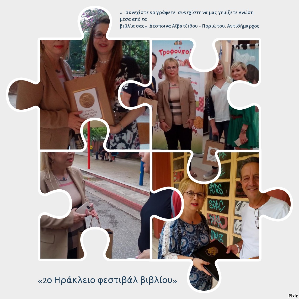 Η Αντιδήμαρχος, θέλοντας να ευχαριστήσει τους συγγραφείς για την παρουσία τους στο «2ο Ηράκλειο Φεστιβάλ Βιβλίου», τους πρόσφερε ένα αναμνηστικό δώρο, λέγοντάς τους: «…συνεχίστε να γράφετε, συνεχίστε να μας γεμίζετε γνώση μέσα από τα βιβλία σας».