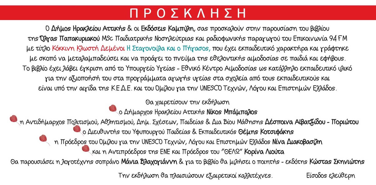 παρουσιάζουν την Κυριακή 15 Απριλίου 2018 και ώρα 11:00 το πρωί, στο Πολιτιστικό Πολύκεντρο «Ηλέκτρα Αποστόλου» του Δήμου Ηρακλείου Αττικής στην οδό Κουντουριώτου 18 Α & Νεότητος, το βιβλίο της Όλγας Παπακυριακού MSc Παιδιατρικής Νοσηλεύτριας Ρ/Π του Επικοινωνία 94 FM με τίτλο «Κόκκινη Κλωστή Δεμένοι – Η Σταγονούλα και ο Πήγασος». Εικονογράφηση Θοδωρής Κανάκης.Το βιβλίο έχει εκπαιδευτικό χαρακτήρα και γράφτηκε με σκοπό να μεταλαμπαδεύσει και να προάγει το πνεύμα της εθελοντικής αιμοδοσίας και μιλάει στις ψυχές των παιδιών και των εφήβων ενδυναμώνοντας την ενσυναίσθηση τους.