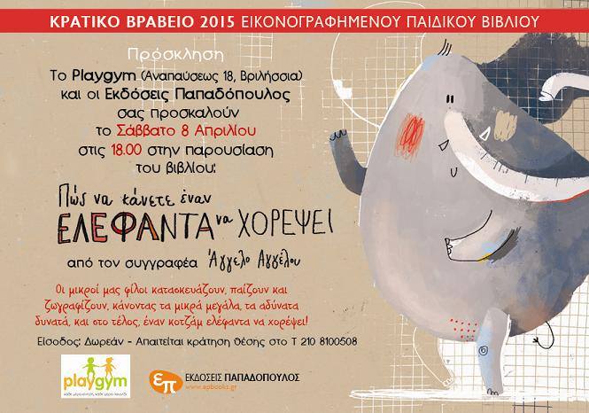 • Ο συγγραφέας Άγγελος Αγγέλου παρουσιάζει το Σάββατο 8 Απριλίου στις 18:00 στο Playgym στα Βριλήσσια το βιβλίο Πώς να κάνετε έναν ελέφαντα να χορέψει που έγραψε μαζί με την Έμη Σίνη και εικονογράφησε η Σοφία Τουλιάτου.