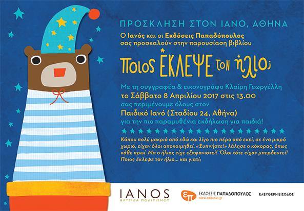 • Η συγγραφέας και εικονογράφος Κλαίρη Γεωργέλλη παρουσιάζει το βιβλίο της Ποιος έκλεψε τον ήλιο; το Σάββατο 8 Απριλίου στις 12:00 μμ στο βιβλιοπωλείο Ιανός στην Αθήνα.