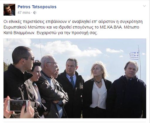 Με μια ανάρτηση στο προσωπικό του προφίλ ο πρώην βουλευτής ζητά «να ιδρυθεί επειγόντως το ΜΕ.ΚΑ.ΒΛΑ.», το «Μέτωπο Κατά Βλαμμένων» δηλαδή, εν αντιθέσει με το Ευρωπαϊκό Μέτωπο, που πρέπει «ν’ αναβληθεί επ’ αόριστον».