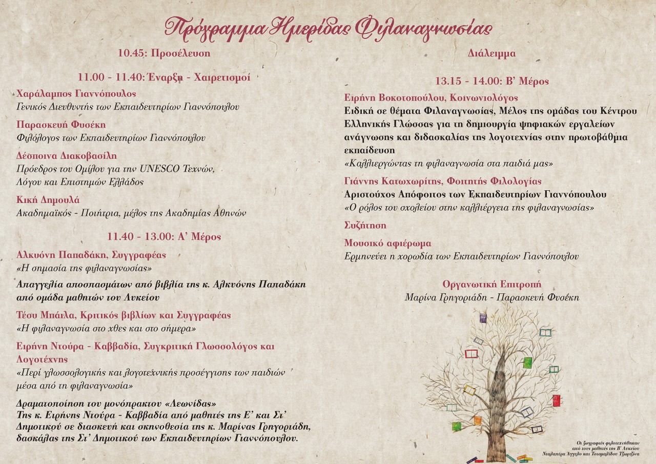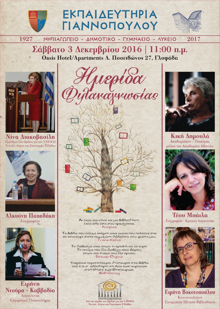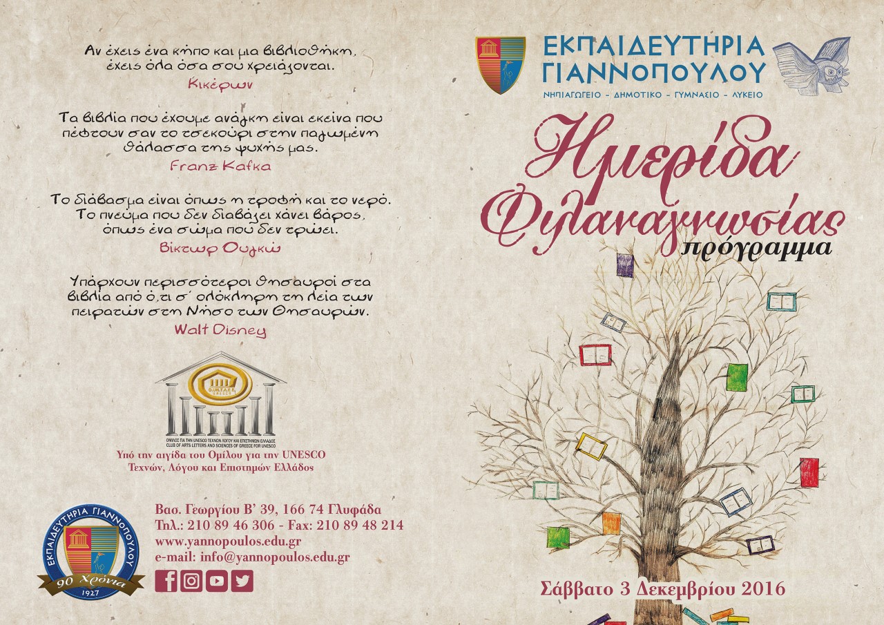 Ημερίδα Φιλαναγνωσίας των Εκπαιδευτηρίων Γιαννόπουλου… που γοητεύει Aylogyros News Η παλιά μας αυλή 01 Δεκεμβρίου 2016 Ο Όμιλος για την UNESCO Τεχνών, Λόγου και Επιστημών Ελλάδος... καλωσορίζει τον Δεκέμβριο, στηρίζοντας με την αιγίδα του, δύο σπουδαίες εκδηλώσεις για τη φιλαναγνωσία και τη λογοτεχνία.Η παρουσία σας θα είναι τιμή και χαρά μας! Προηγούμενο Επόμενο