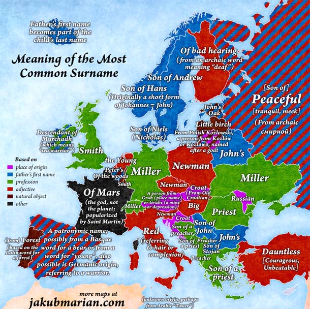 κάνει διάφορες γλωσσολογικές και μη έρευνες – και τις δημοσιεύει στο προσωπικό μπλόγκ του. Ανάμεσα στα άλλα, κάποια στιγμή ασχολήθηκε και με την Ονοματολογία, την οποία θεωρεί έναν πολύ ενδιαφέροντα κλάδο. Έψαξε λοιπόν και βρήκε ποιο είναι το πιο κοινό επώνυμο σε κάθε χώρα της Ευρώπης, καθώς και τι σημαίνει.Στην φωτογραφία θα δεις τα επώνυμα και στην κάτω τη σημασία τους.