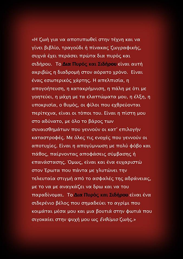 Μόλις ολοκλήρωσα την τέταρτη Συλλογή μου «Δια Πυρός και Σιδήρου» με τις εκδόσεις Bookstarς και προχωρώ στην ολοκλήρωση του νέου μου μυθιστορήματος «Η Ποινή της Ελευθερίας».