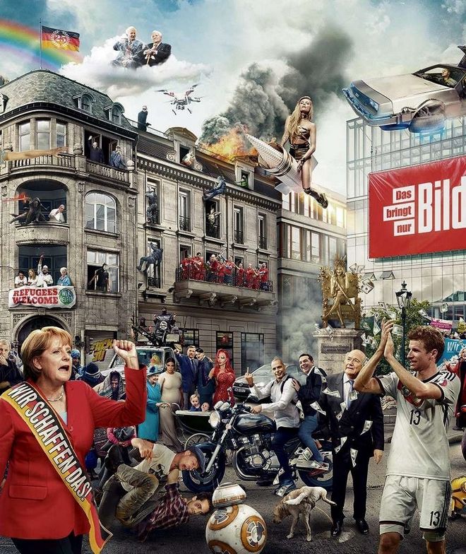 στο ίδιο καρέ, μαζί με τα Minions, τη Μάιλι Σάιρους, την Κιμ Καρντάσιαν και πολλούς άλλους.Η Bild συνθέτει τα πρόσωπα και τα γεγονότα της χρονιάς στο σημερινό της εξώφυλλο. Δεν λείπουν οι διαμάχες για τη Συρία, το Star Wars αλλά και η εθνική Γερμανίας.