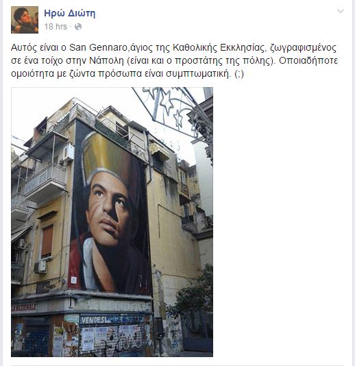 άγιο τον Αλέξη Τσίπρα, αναρωτιούνται πολλοί που αντικρίζουν συγκεκριμένη τοιχογραφία που κοσμεί κτήριο στην ιταλική πόλη.Πρόκειται για ένα… τεράστιο έργο, που καλύπτει έναν τοίχο τριώροφου κτηρίου και απεικονίζει τον Σαν Τζενάρο, τον πολιούχο της Νάπολης. Το σχέδιο όμως του αγίου και η φυσιογνωμία του θυμίζουν πολύ τον Έλληνα πρωθυπουργό, με αποτέλεσμα όσοι το βλέπουν για πρώτη φορά να… μπερδεύονται!