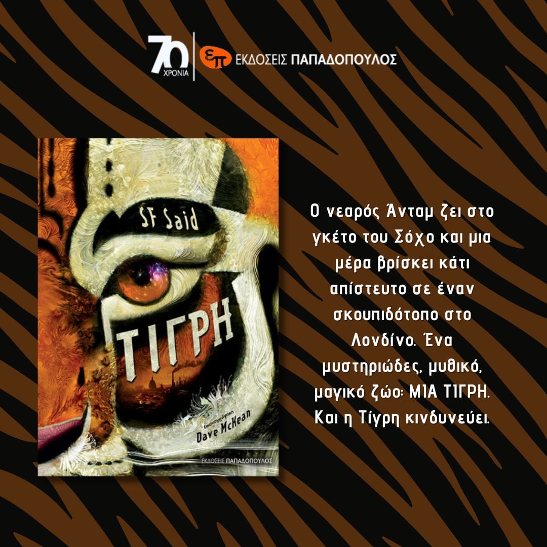 Ο συγγραφέας SF Said χρειάστηκε σχεδόν 9 χρόνια για να δημιουργήσει τον κόσμο που θα γνωρίσουμε στο βιβλίο, ο οποίος ζωντανεύει με τις ασπρόμαυρες εικόνες του Dave McKean. H «Τίγρη» κυκλοφορεί από τις Εκδόσεις Παπαδόπουλος και έχει κερδίσει πολλά βραβεία και διακρίσεις, ανάμεσά τους και το British Book Award for Children’ s Fiction 2023, και έχει συμπεριληθεί στις λίστες κορυφαίων παιδικών βιβλίων σε πολλά σημαντικά έντυπα.